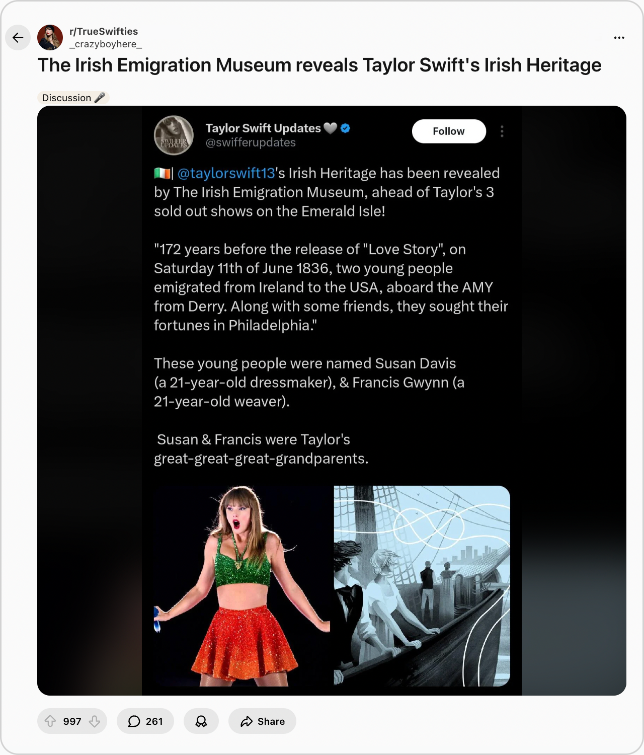 We commissioned a genealogy study, uncovering Taylor Swift’s previously unknown Irish heritage, and turned that ancestry report into a song.